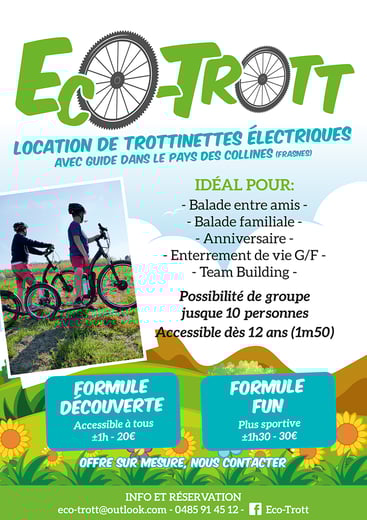 Au départ du Pays des Collines, Eco-trott vous propose 2 balades accompagnées d’un guide. Chaque balade est précédée d’une initiation qui permet de prendre en main rapidement la Trott ! Un casque et des lunettes vous sont fournis.
